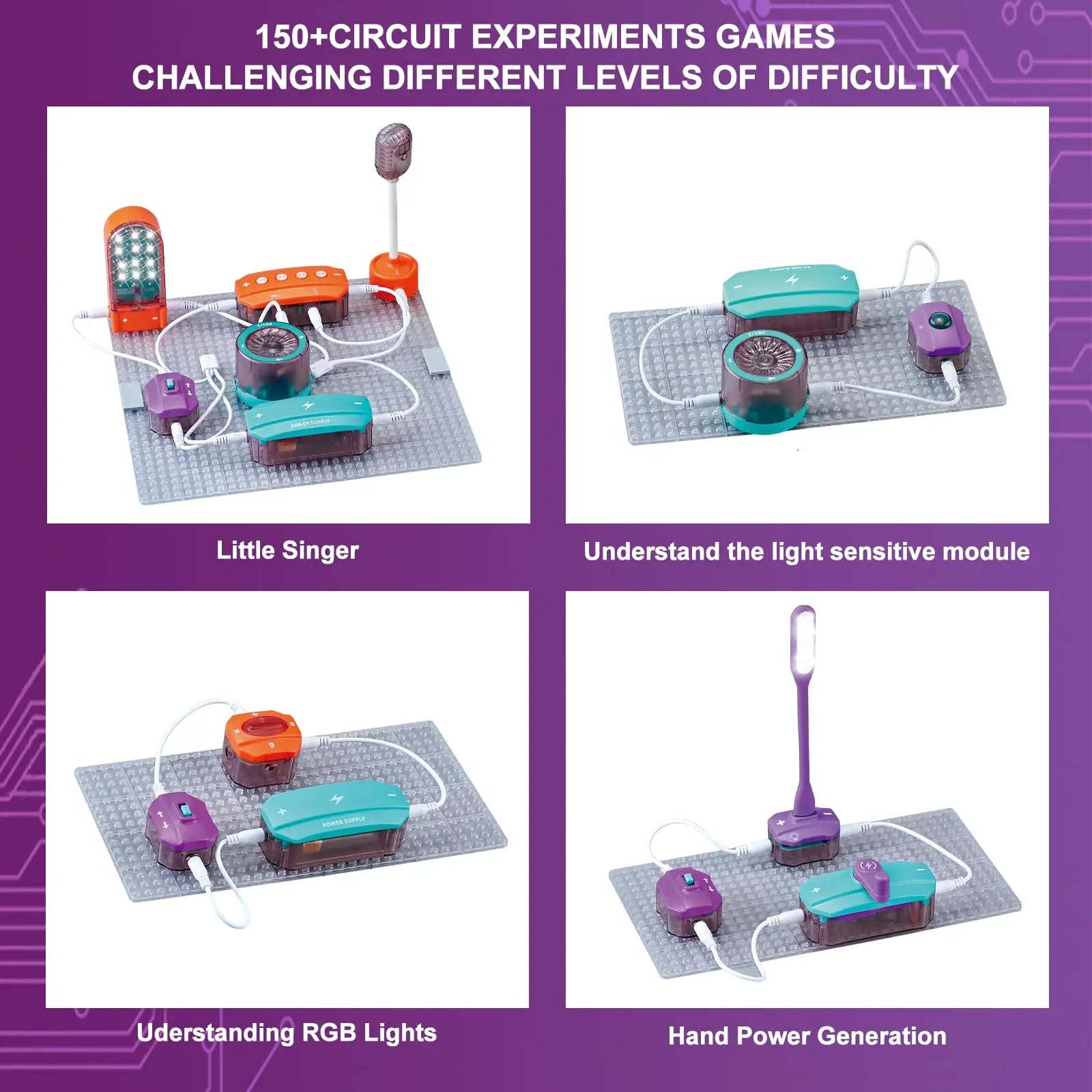 Includes 151 circuit projects, from basic light bulb setups to advanced series and parallel circuits.
